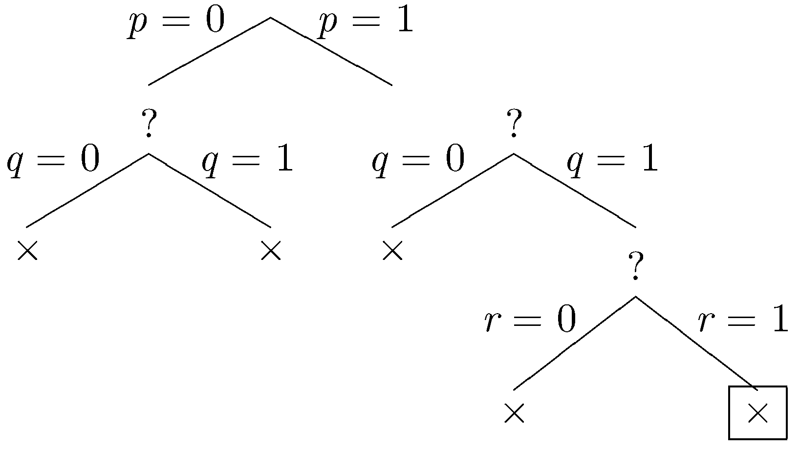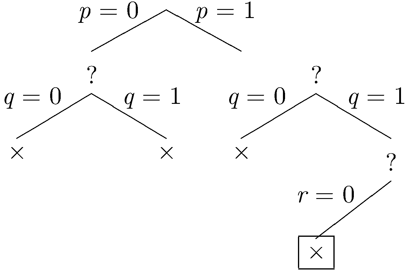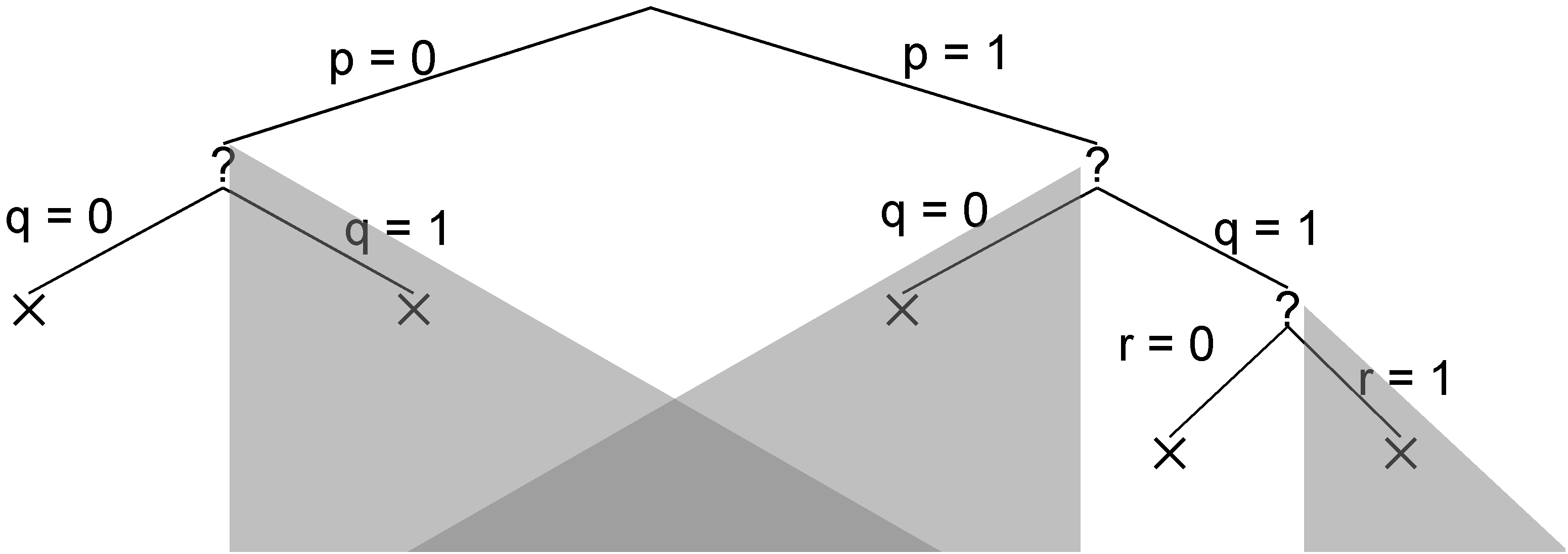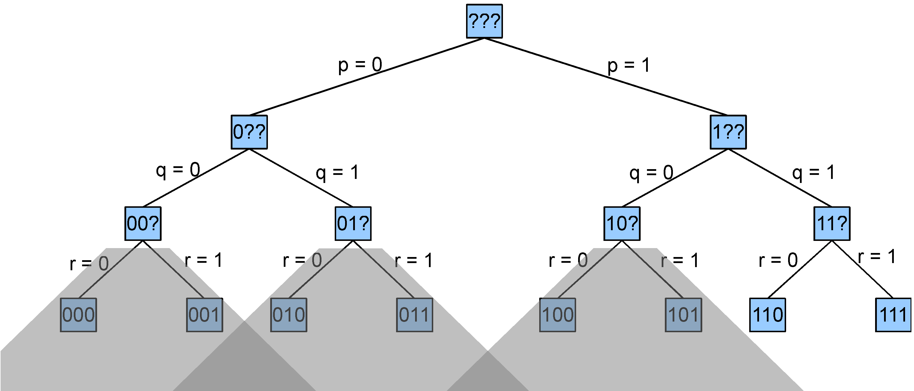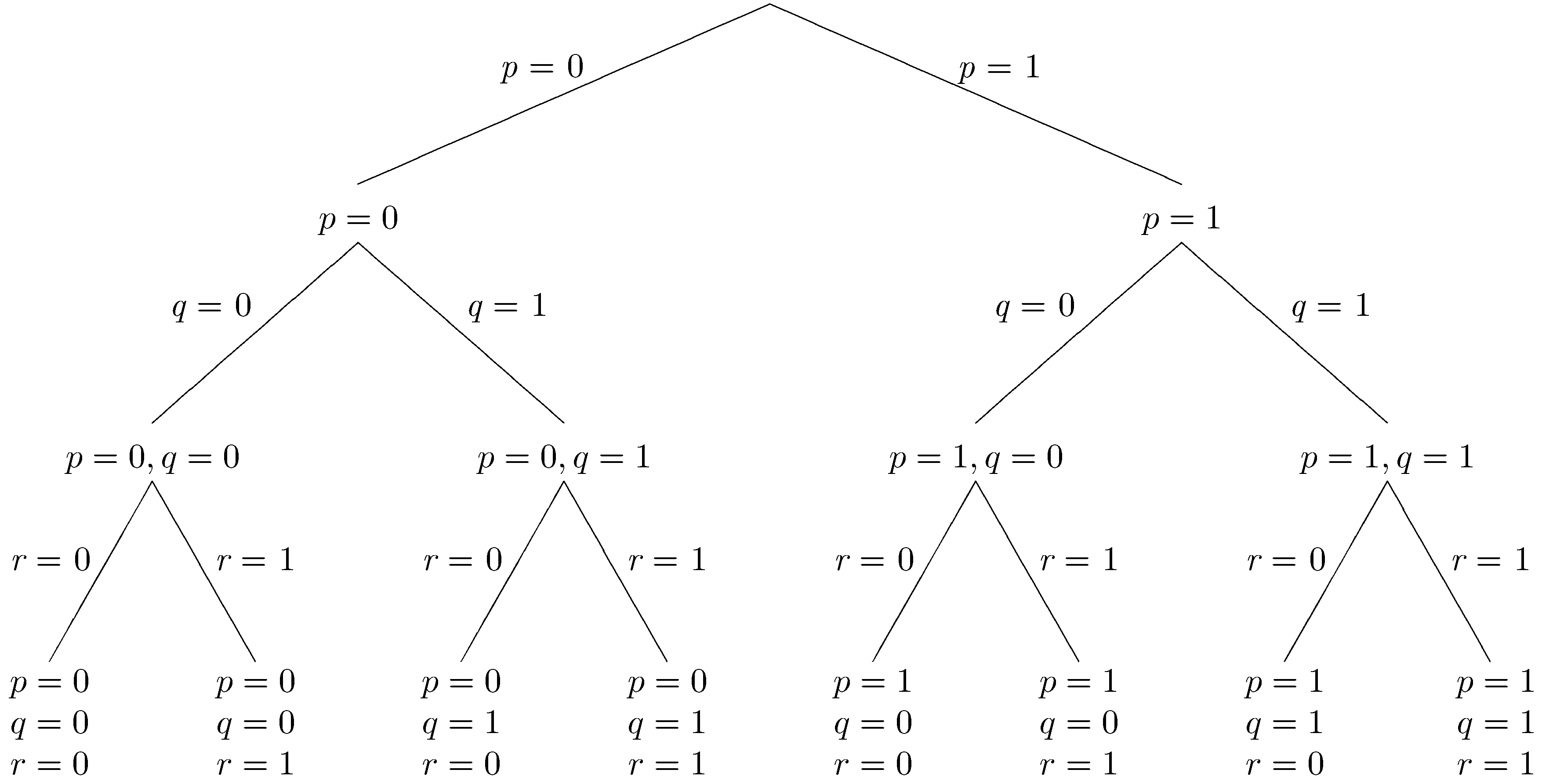 The tree shown below is an example for a Herbrand base with just three factoids (p, q, and r). The eight fringe nodes correspond to the eight possible datasets. We have written p=0 here to mean that p is not in the dataset and p=1 to mean that p is in the dataset. So, the leftmost fringe node represents the empty dataset, and the rightmost fringe node represents the dataset consisting of all three factoids.