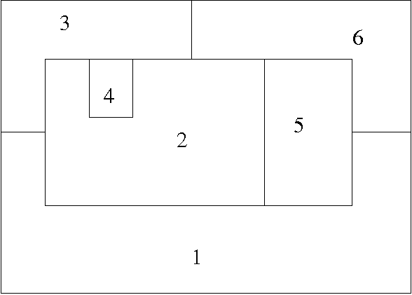 A typical map is shown below. There are six regions. Some are adjacent to each other, meaning that they cannot be assigned the same color. Others are not adjacent, meaning that they can be assigned the same color.